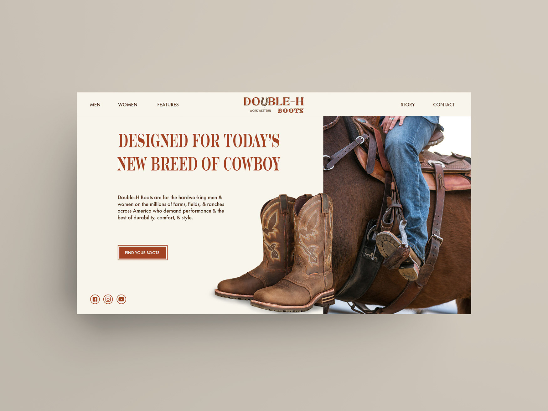 The main objective in rebranding Double-H Boots was to redesign their logo, focusing on the use of typography. The main goal for the logo was to refresh and adapt to the customers' expectations. The new serif and decorative typeface compliment a timeless clean aesthetic, yet still exhibit the western artisan. Moving forward, the logo was reimagined on new retail packaging. The shoe box utilizes the bright trim to stand out when stacked upon each other. A landing page is included, emphasizing the brand's tagline "Designed for Today's New Breed of Cowboy". It is redesigned to showcase a best selling style with the focal boot placed in the middle of the screen.
